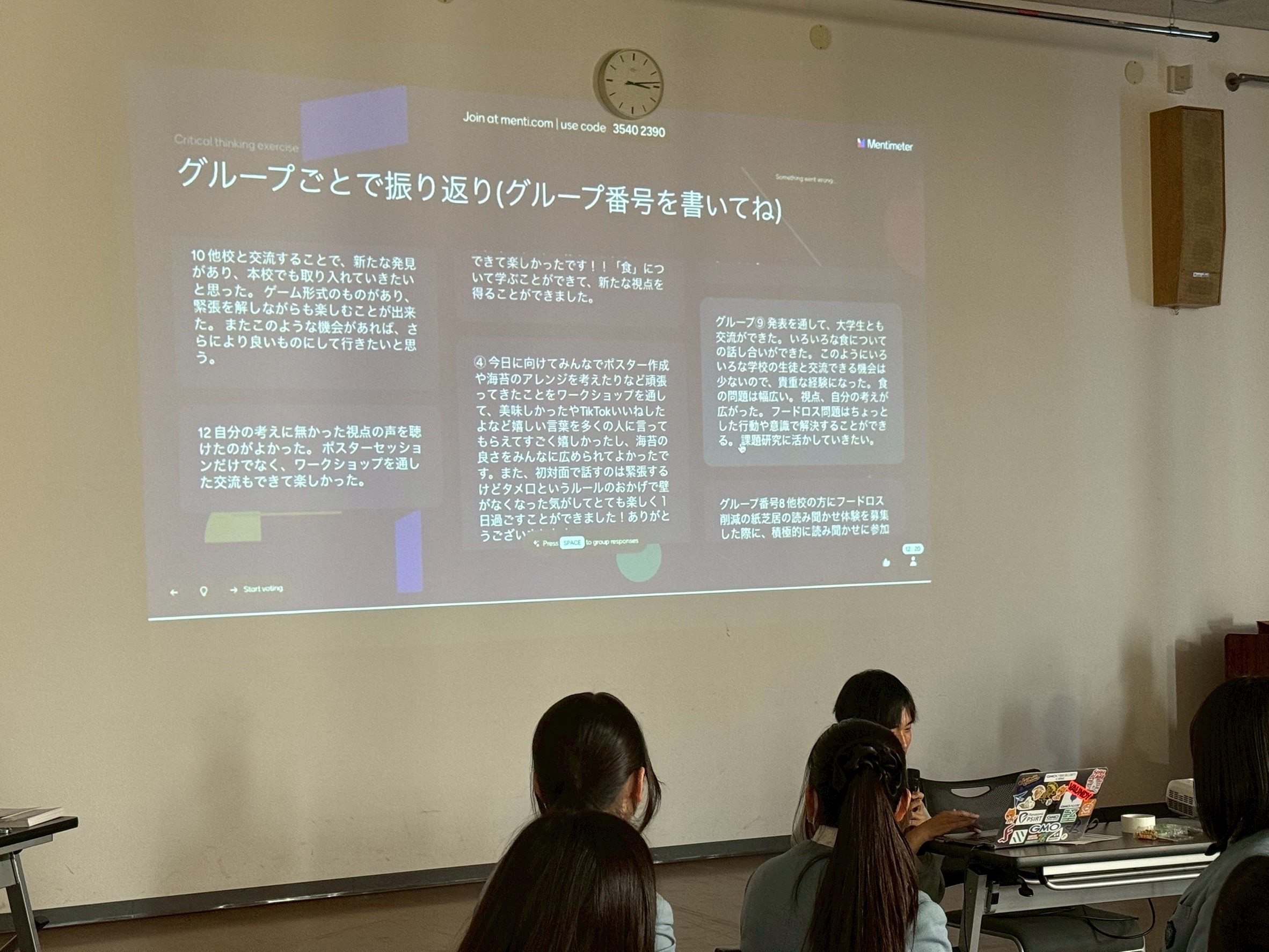 自分たちの学校と他の学校を比べて、考えることも対策も、問題点も全く違っておもしろいなと感じた。フードロスをどうなくすか、どのようにしたら少なくなるか、そのフードロスと何がつながるかなど、自分にはない視点でみたことなどを聞けて、とてもいい学びになった。地域の人々と伝統の関係など、興味深いことがたくさん分かって良かったと思う。