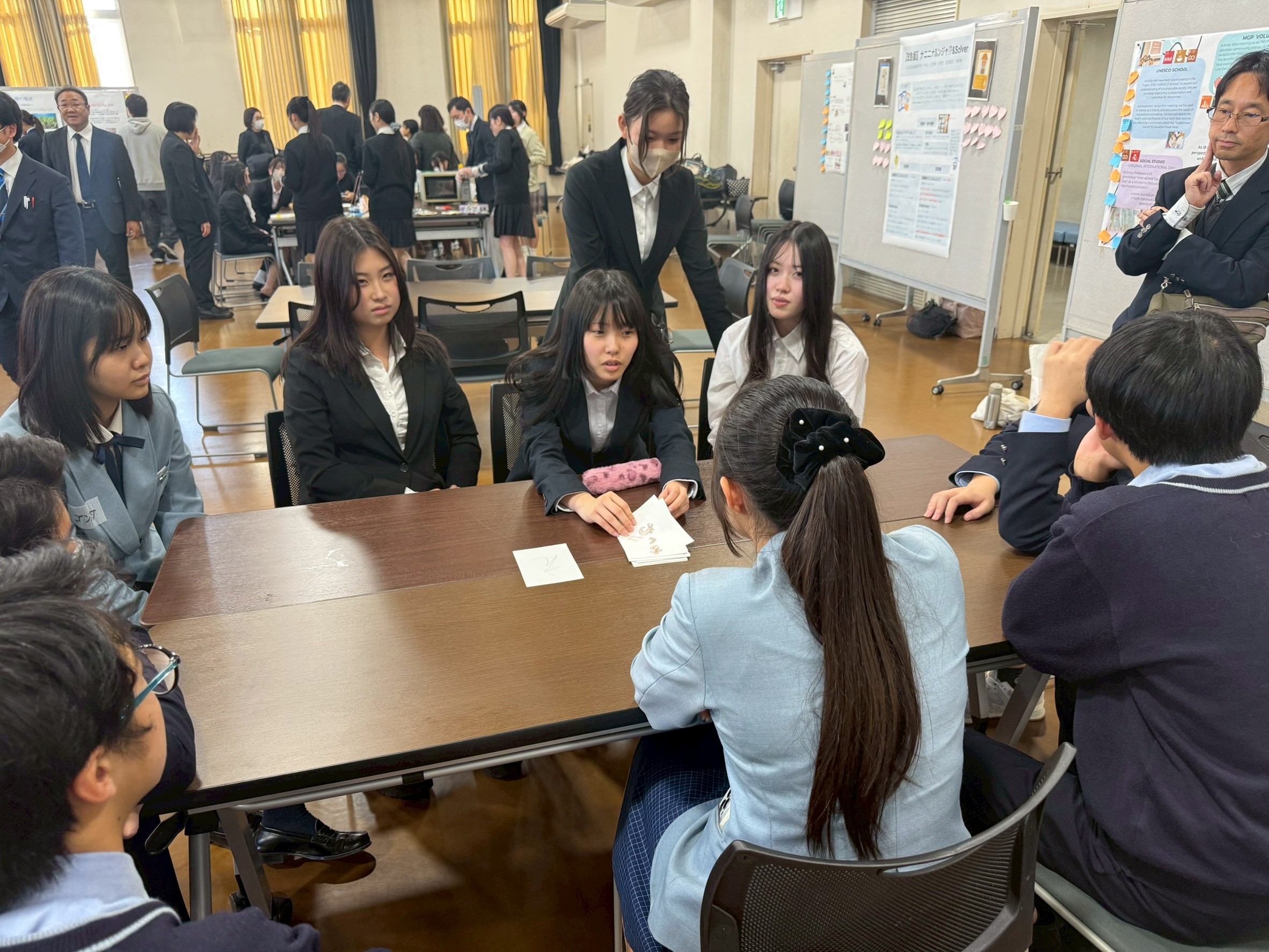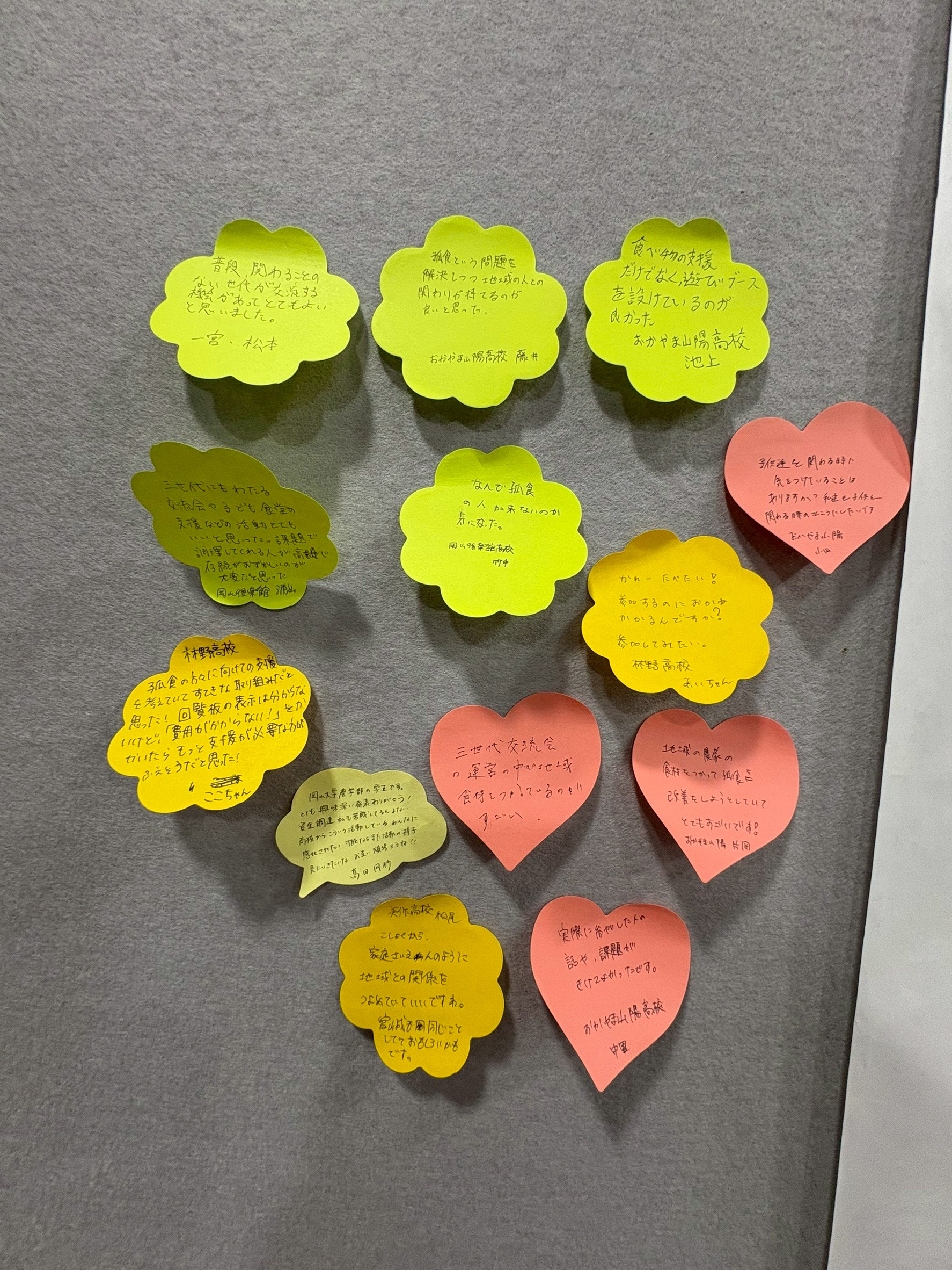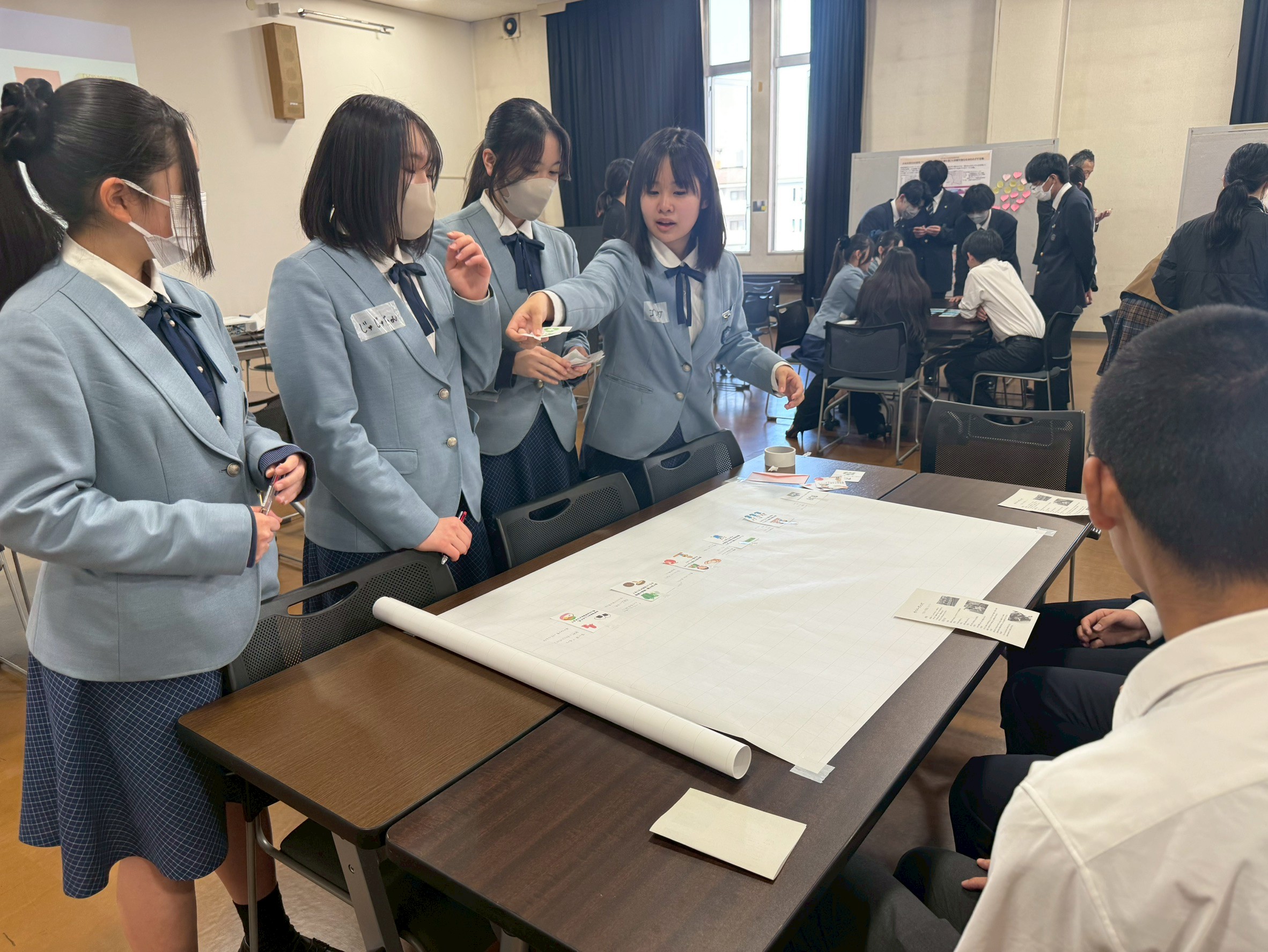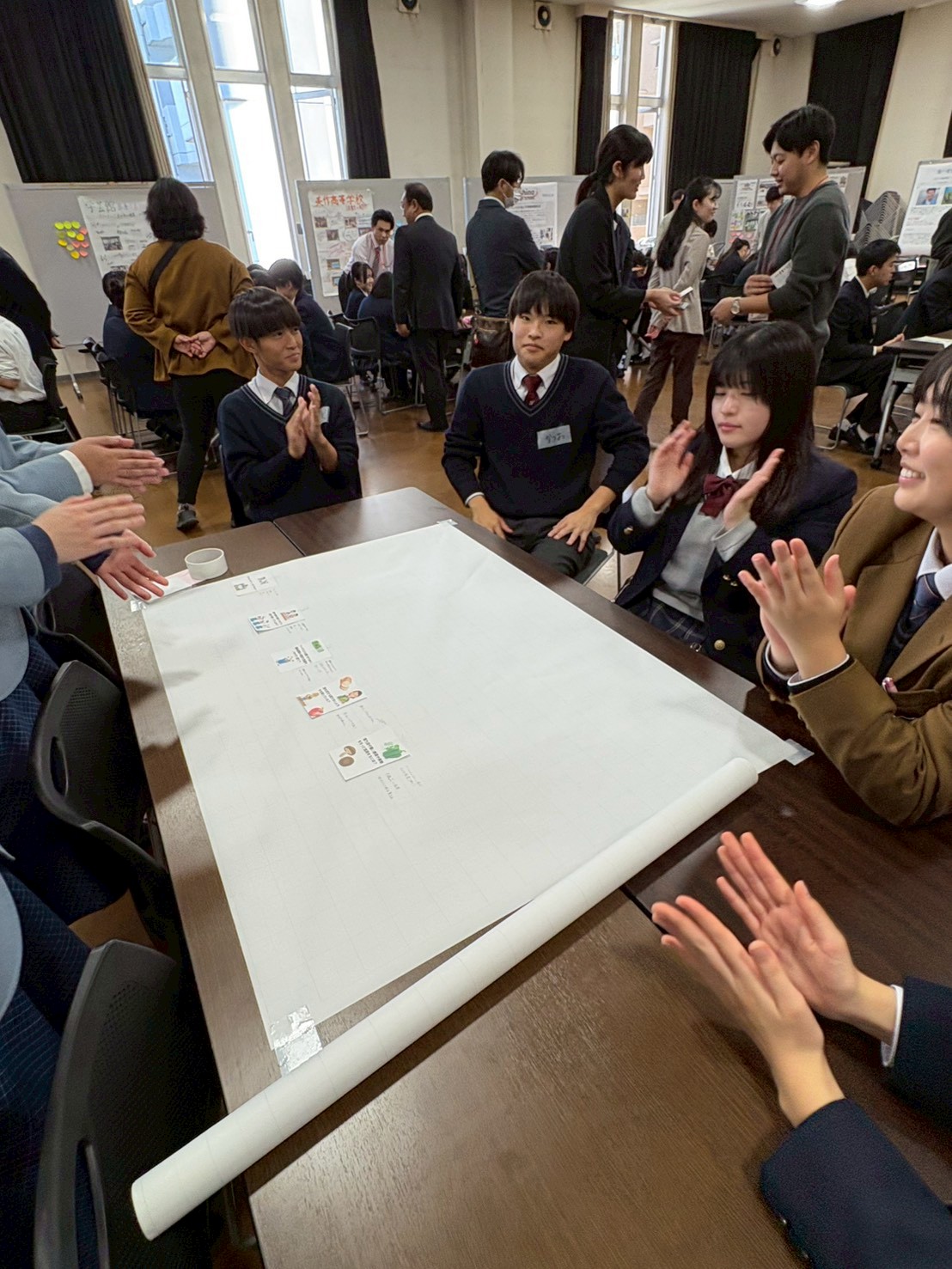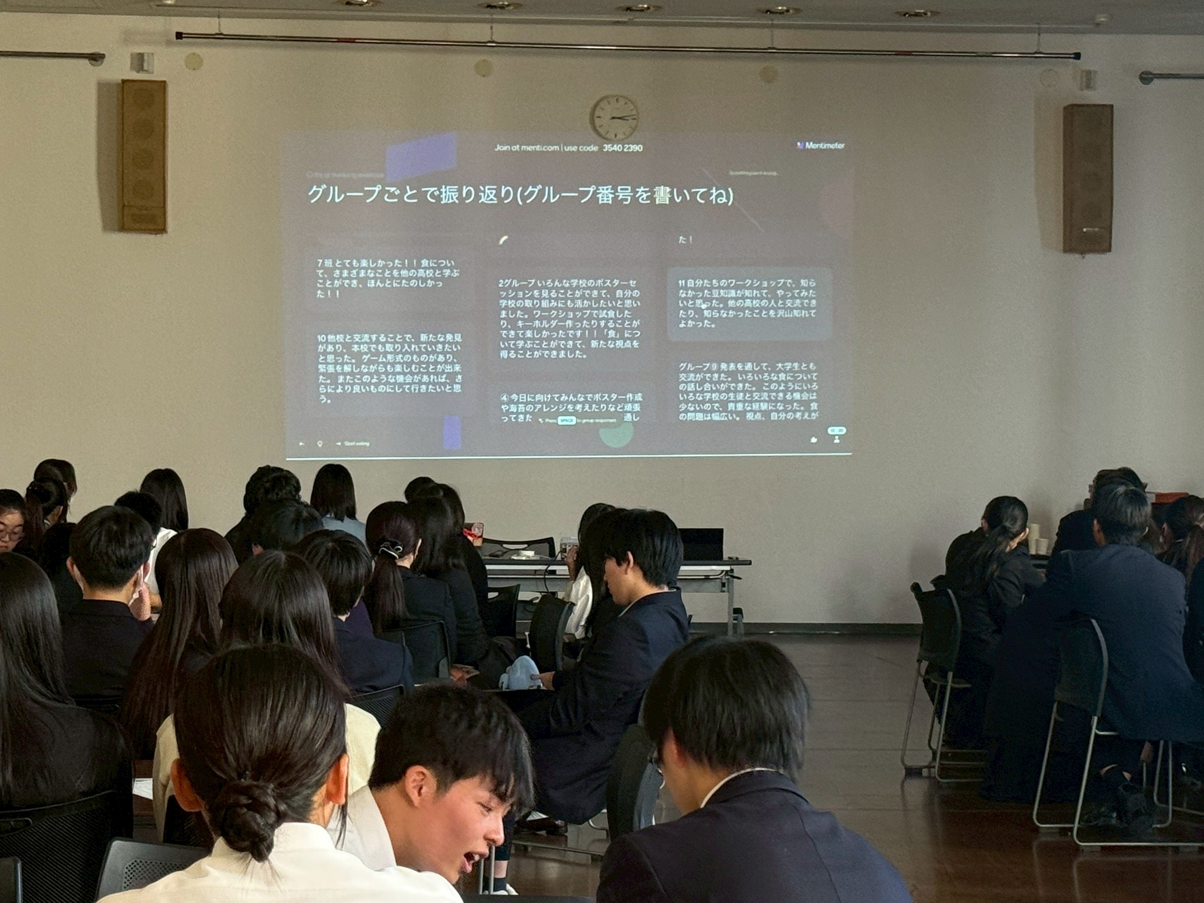 ポスターセッションでは、参加校の生徒たちがそれぞれの活動を紹介し合いました。互いに「良い」と思った点を付箋に書いて貼り付け、生徒同士が褒め合い、認め合う姿が見られました。