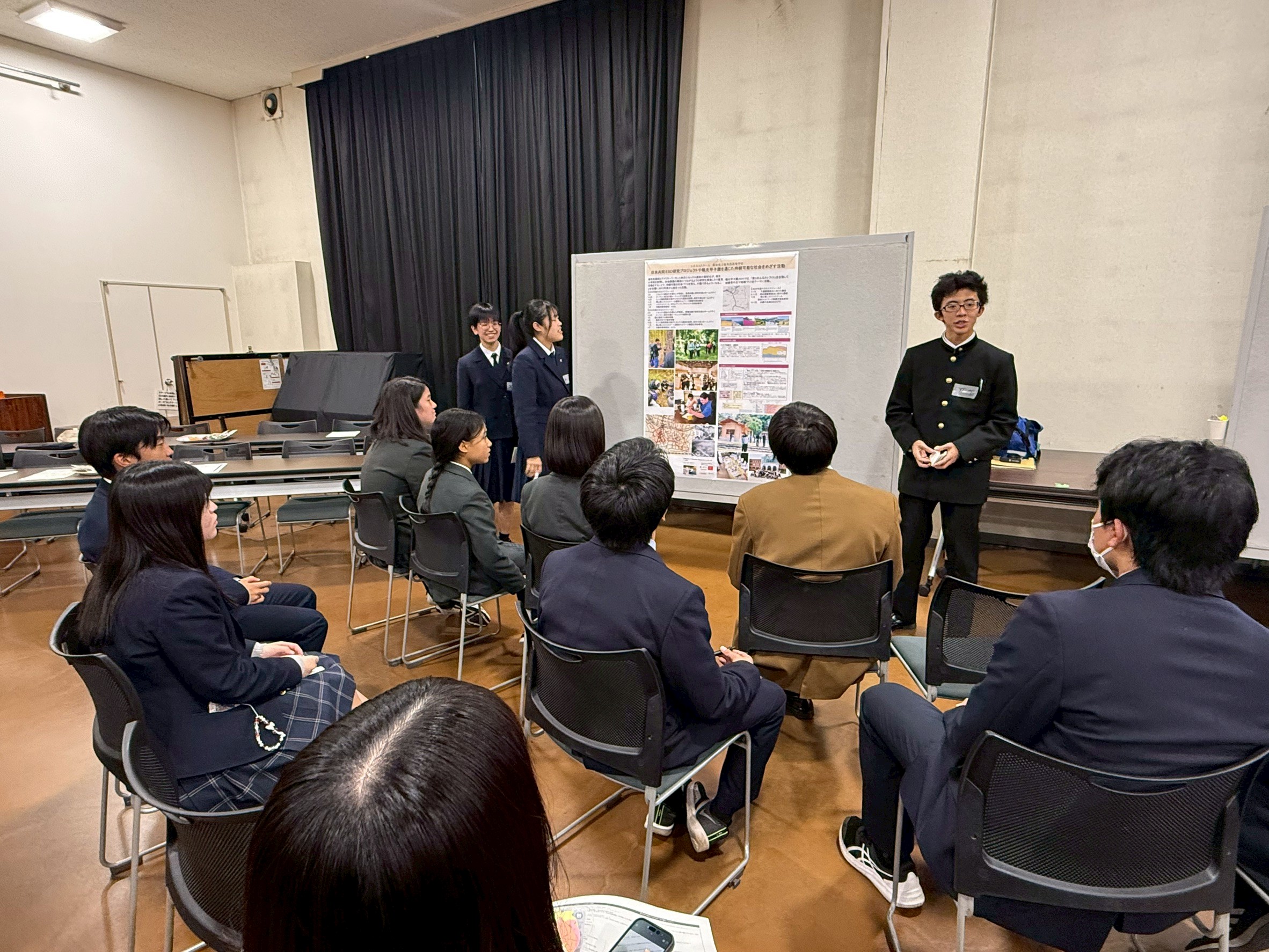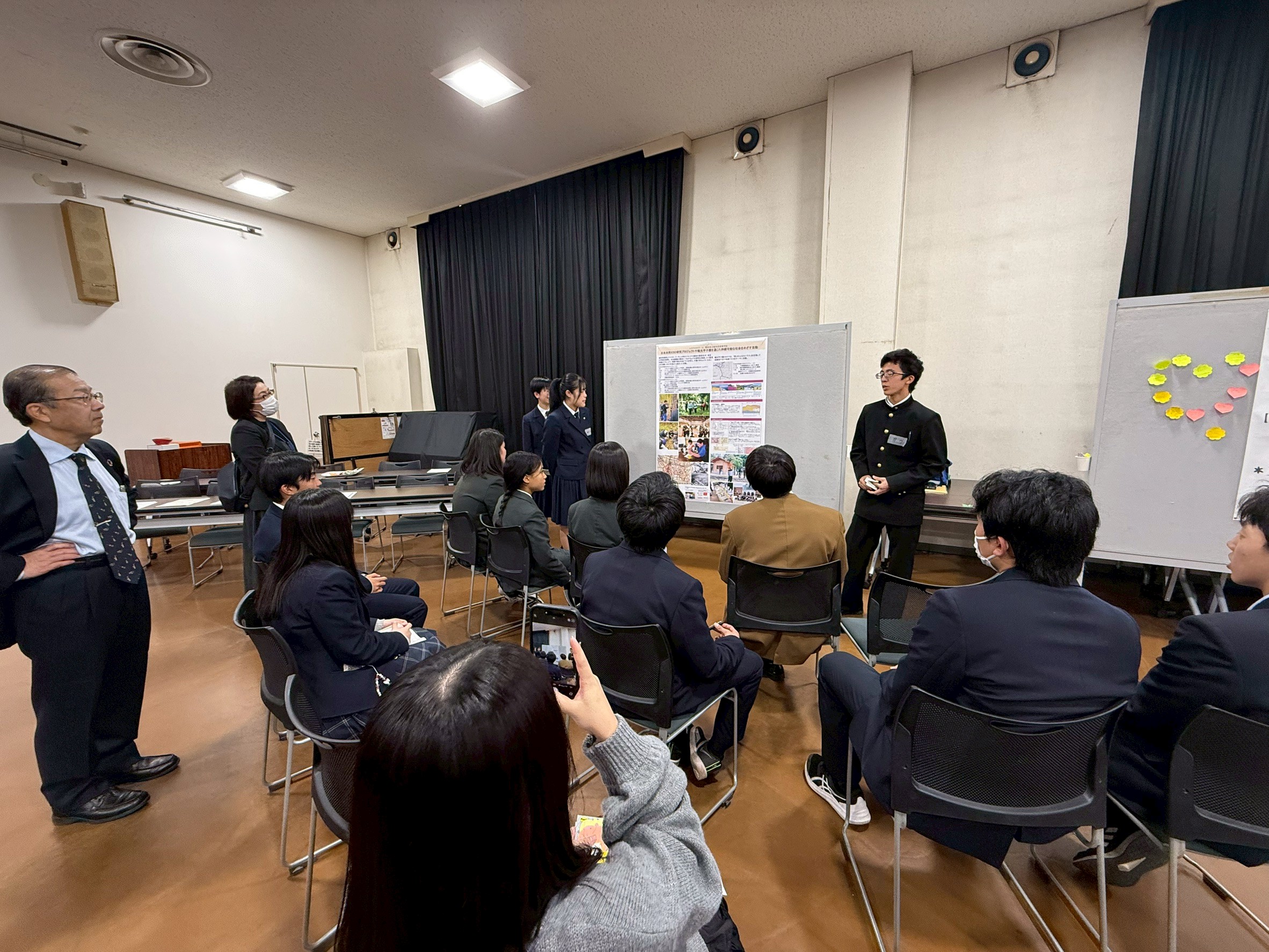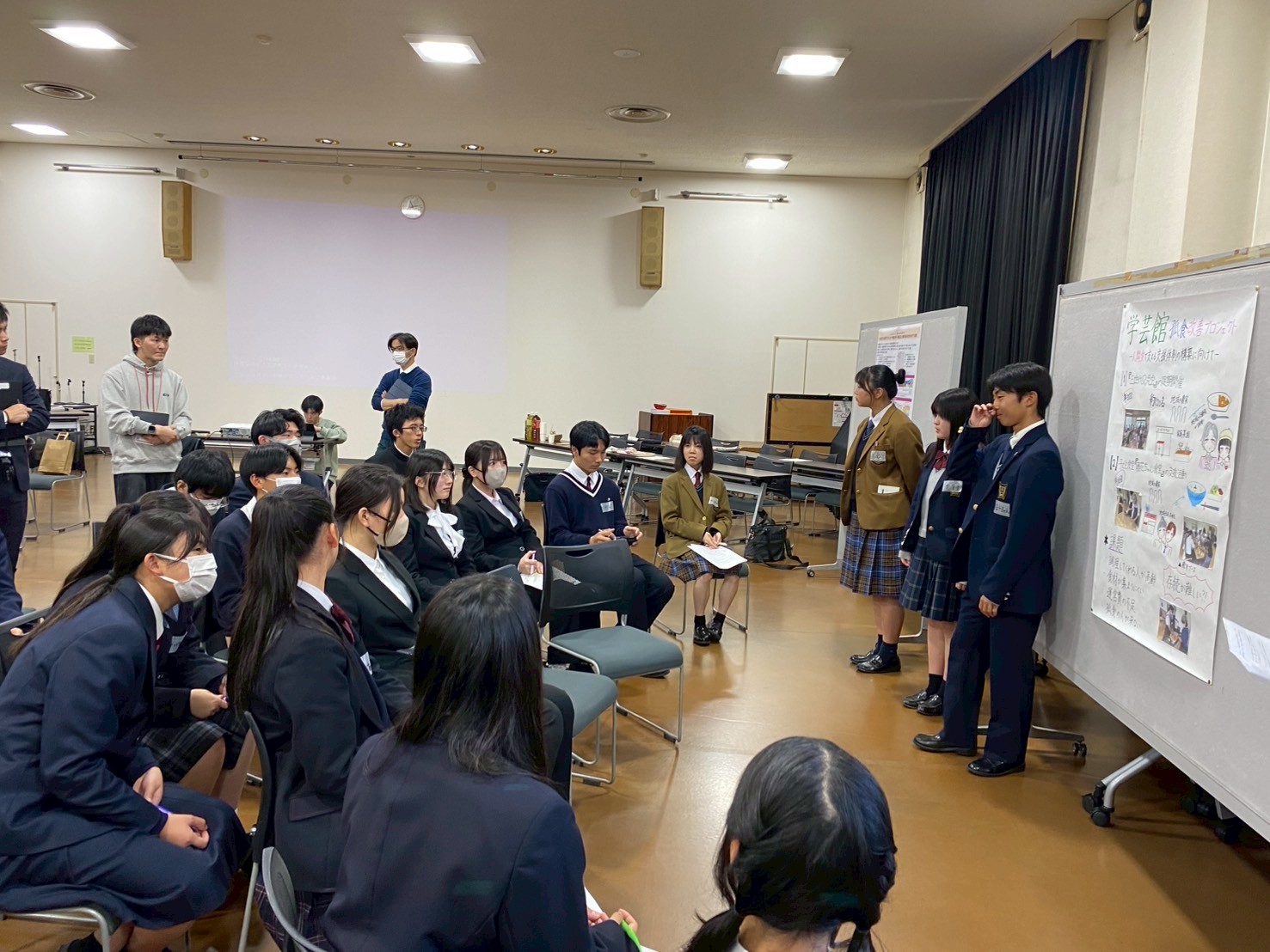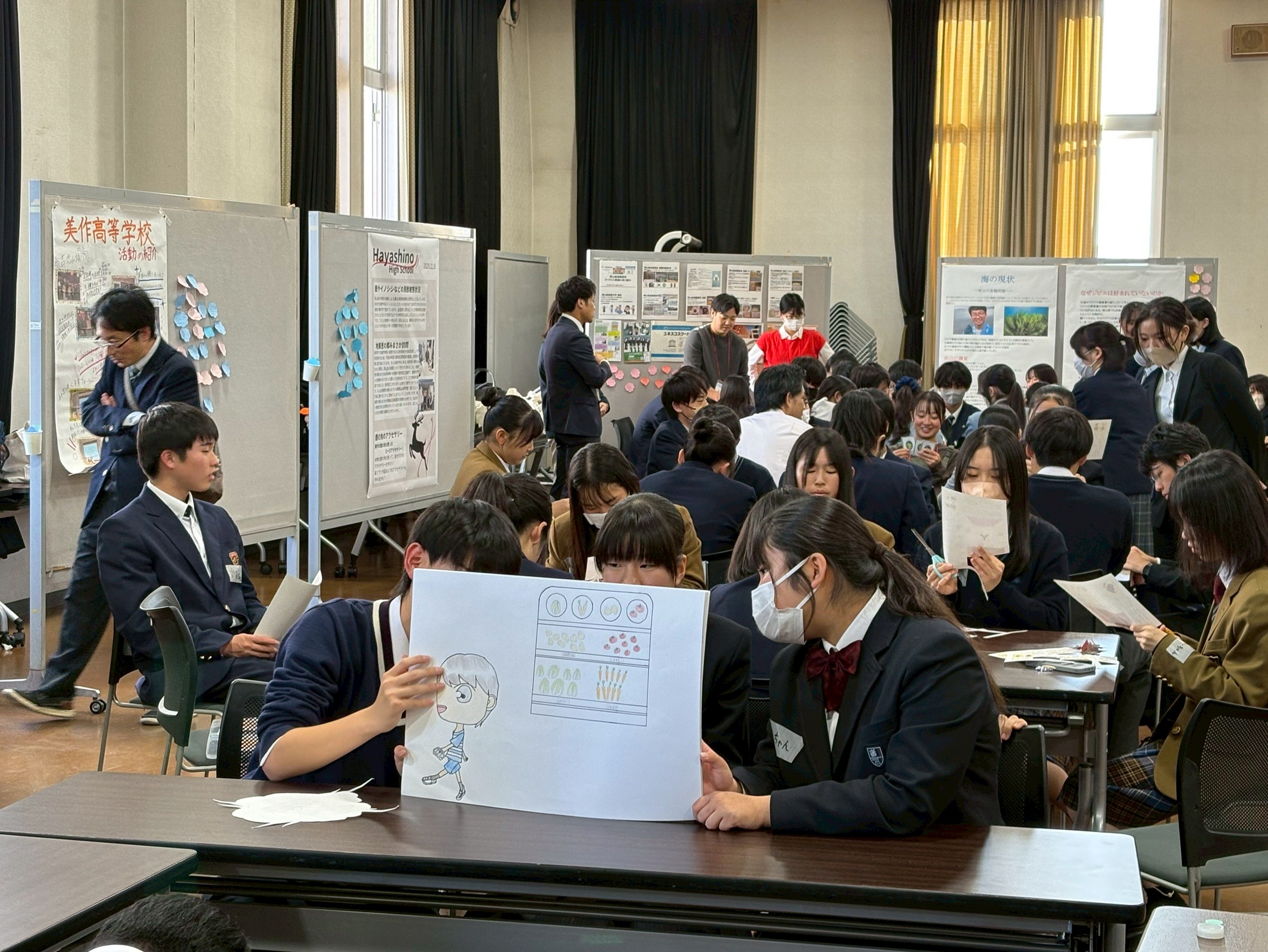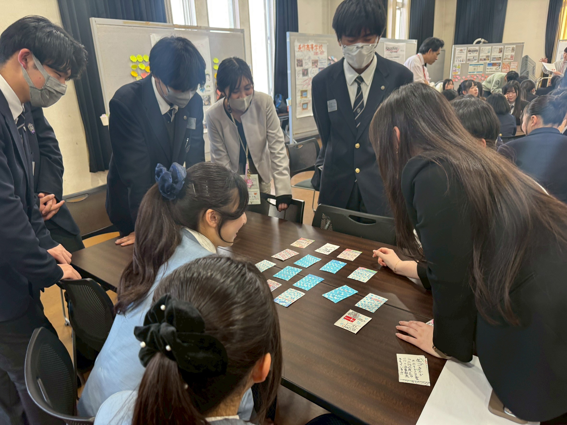 ポスターセッションでは、参加校の生徒たちがそれぞれの活動を紹介し合いました。互いに「良い」と思った点を付箋に書いて貼り付け、生徒同士が褒め合い、認め合う姿が見られました。