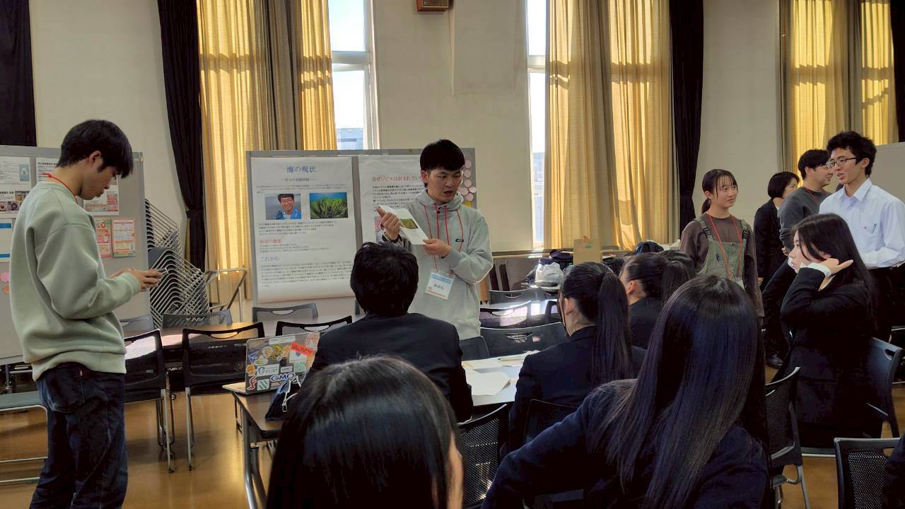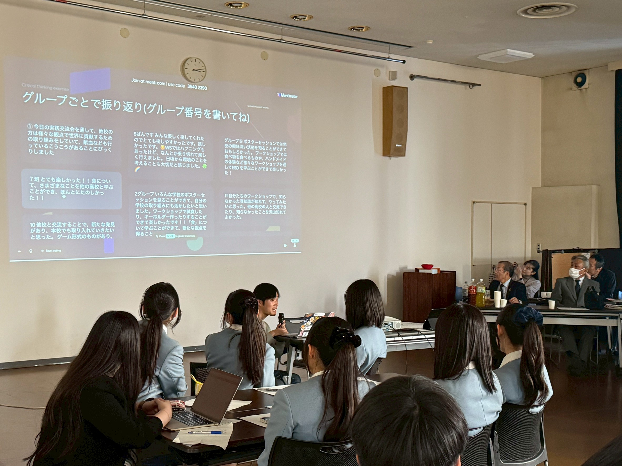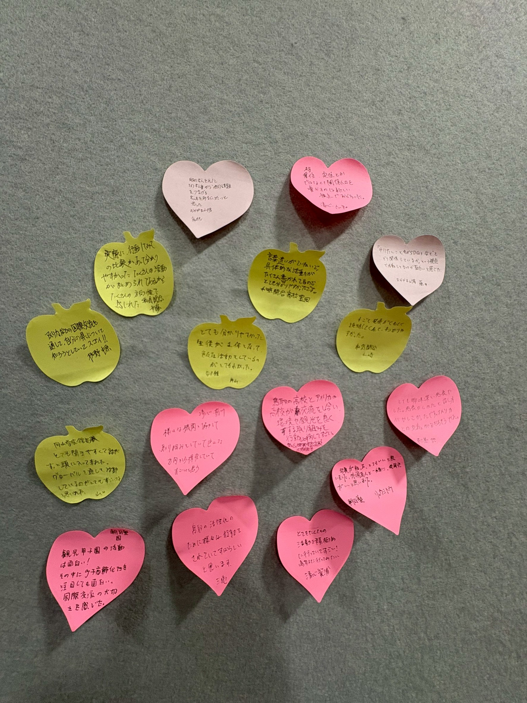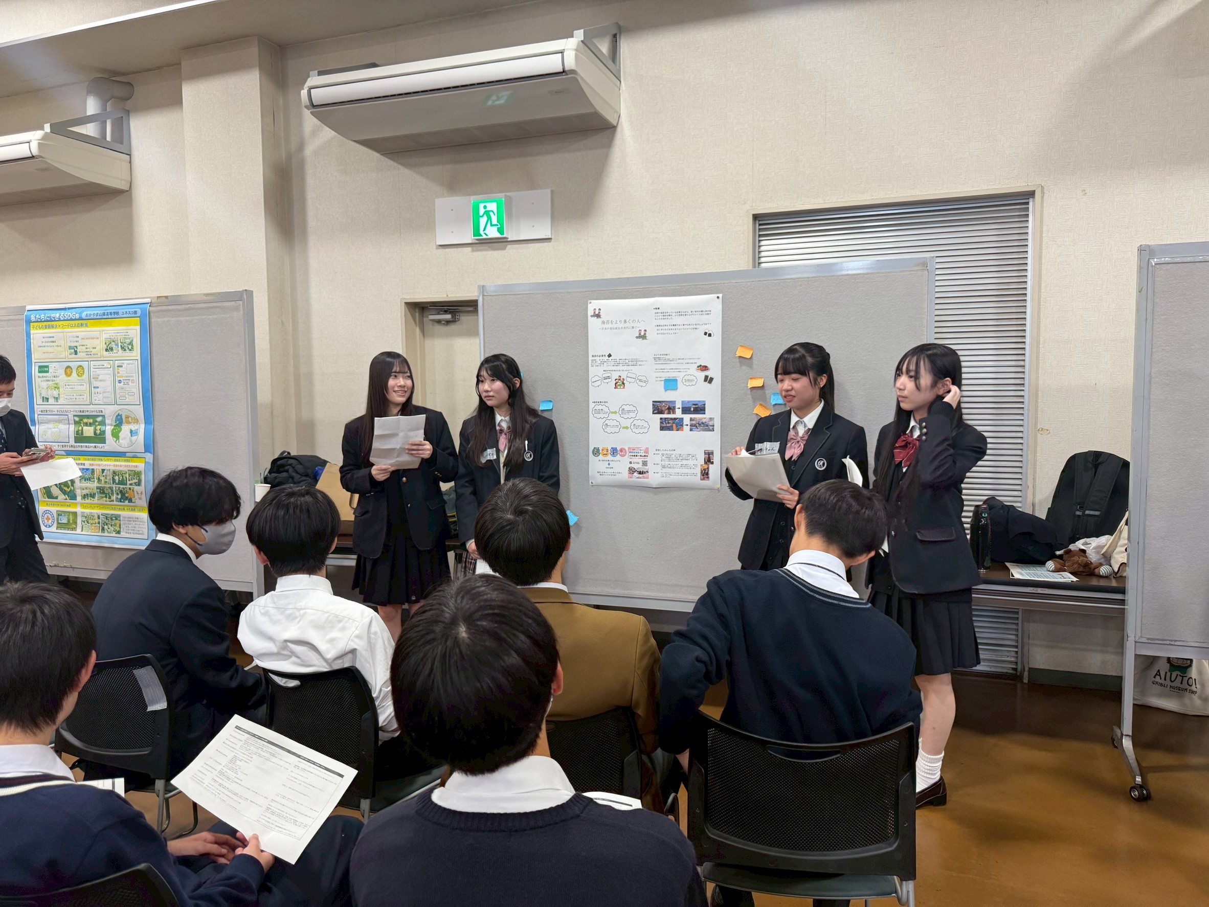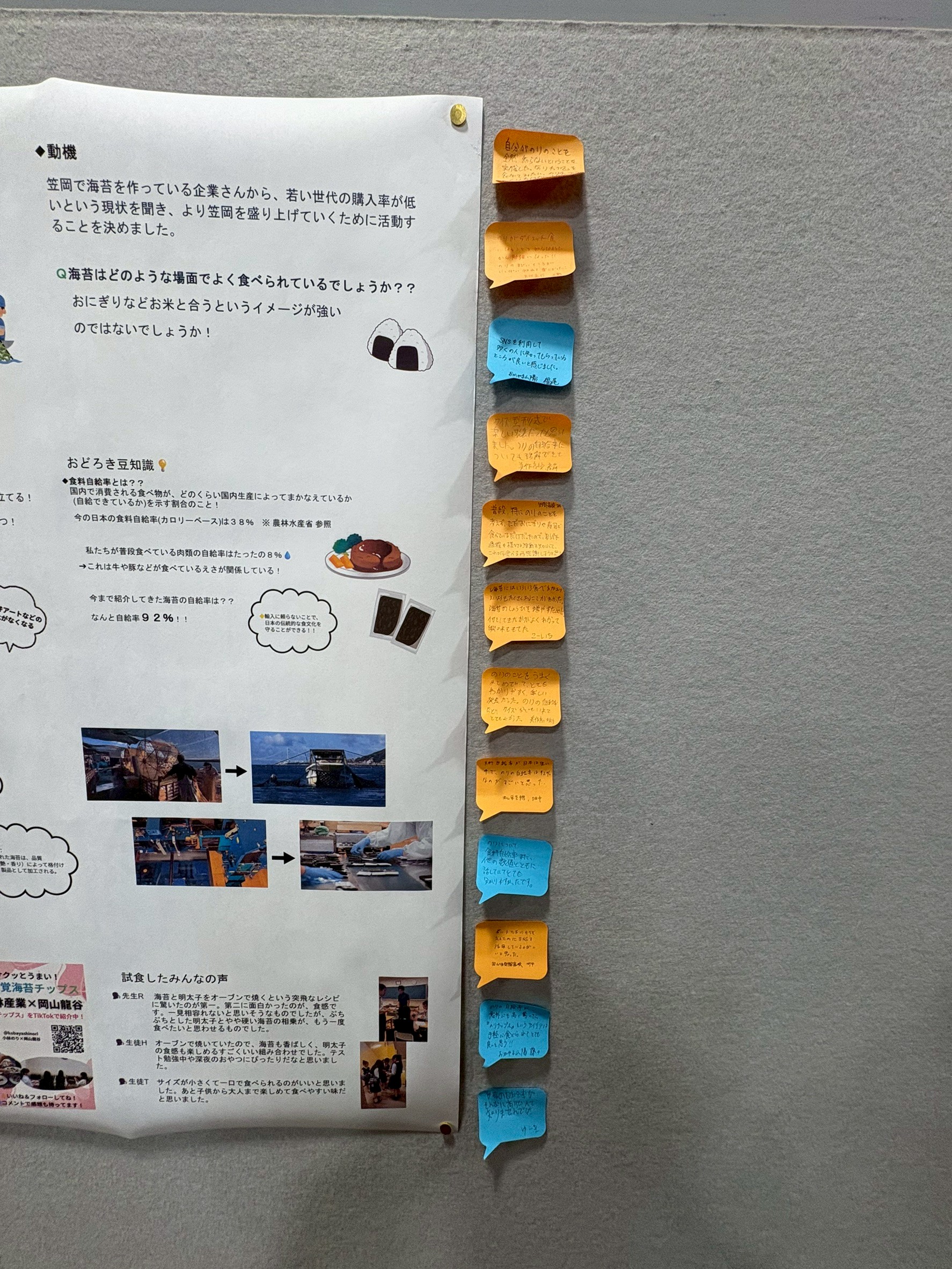 ポスターセッションでは、参加校の生徒たちがそれぞれの活動を紹介し合いました。互いに「良い」と思った点を付箋に書いて貼り付け、生徒同士が褒め合い、認め合う姿が見られました。