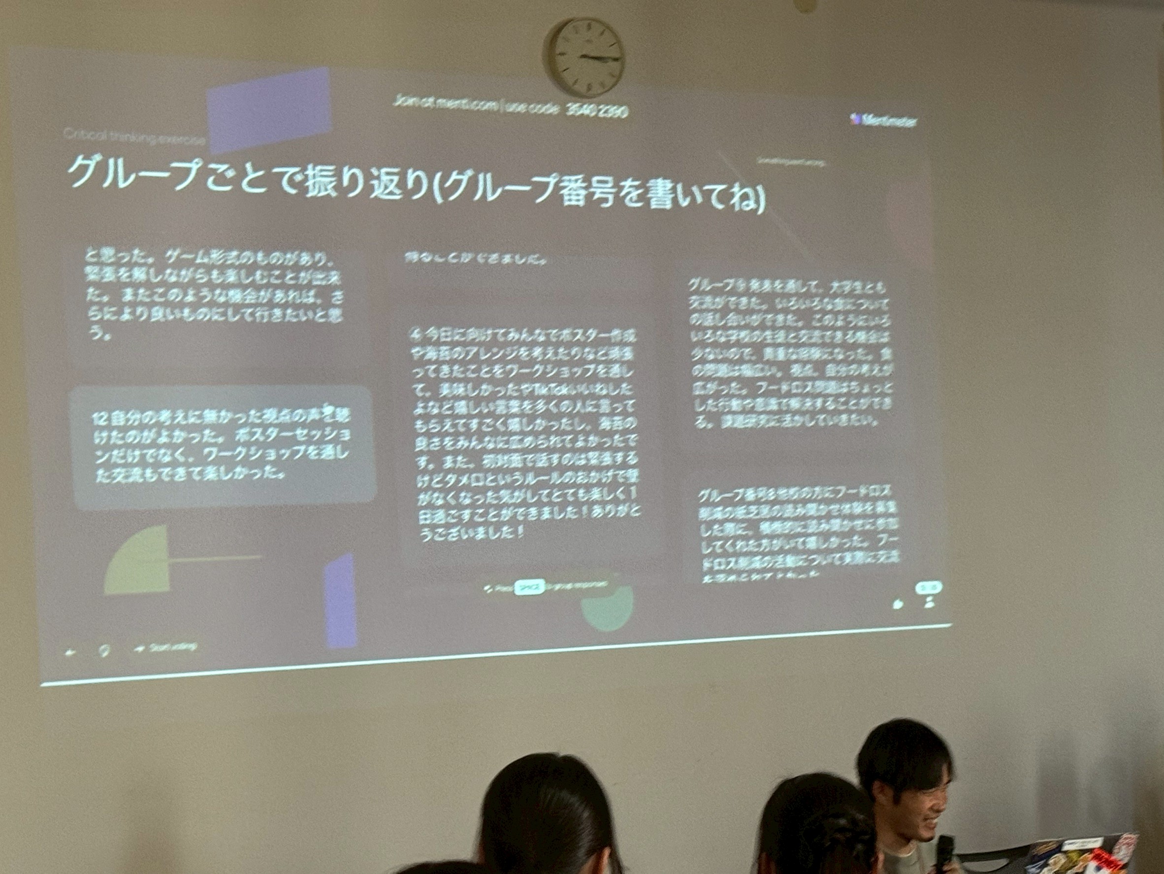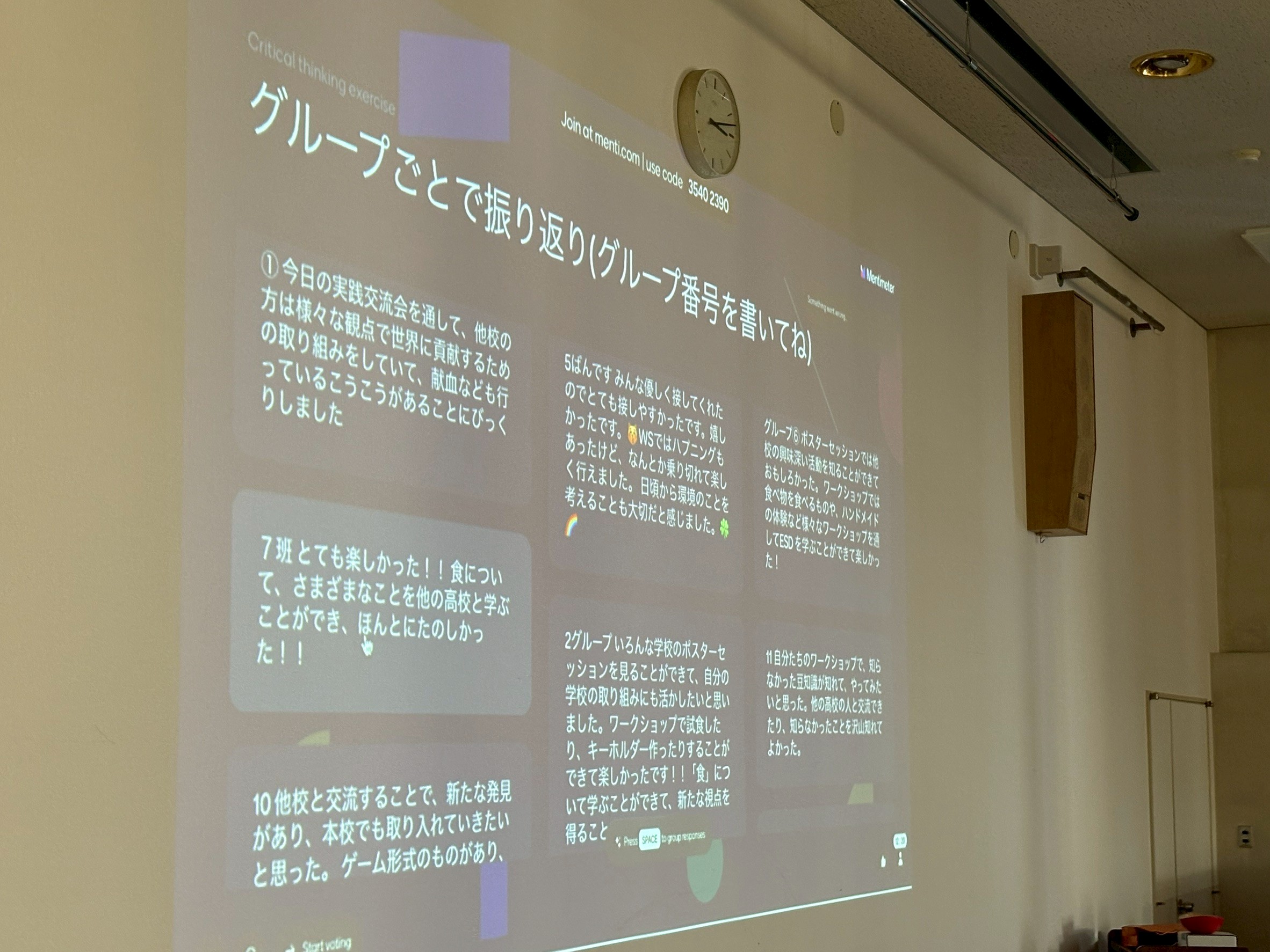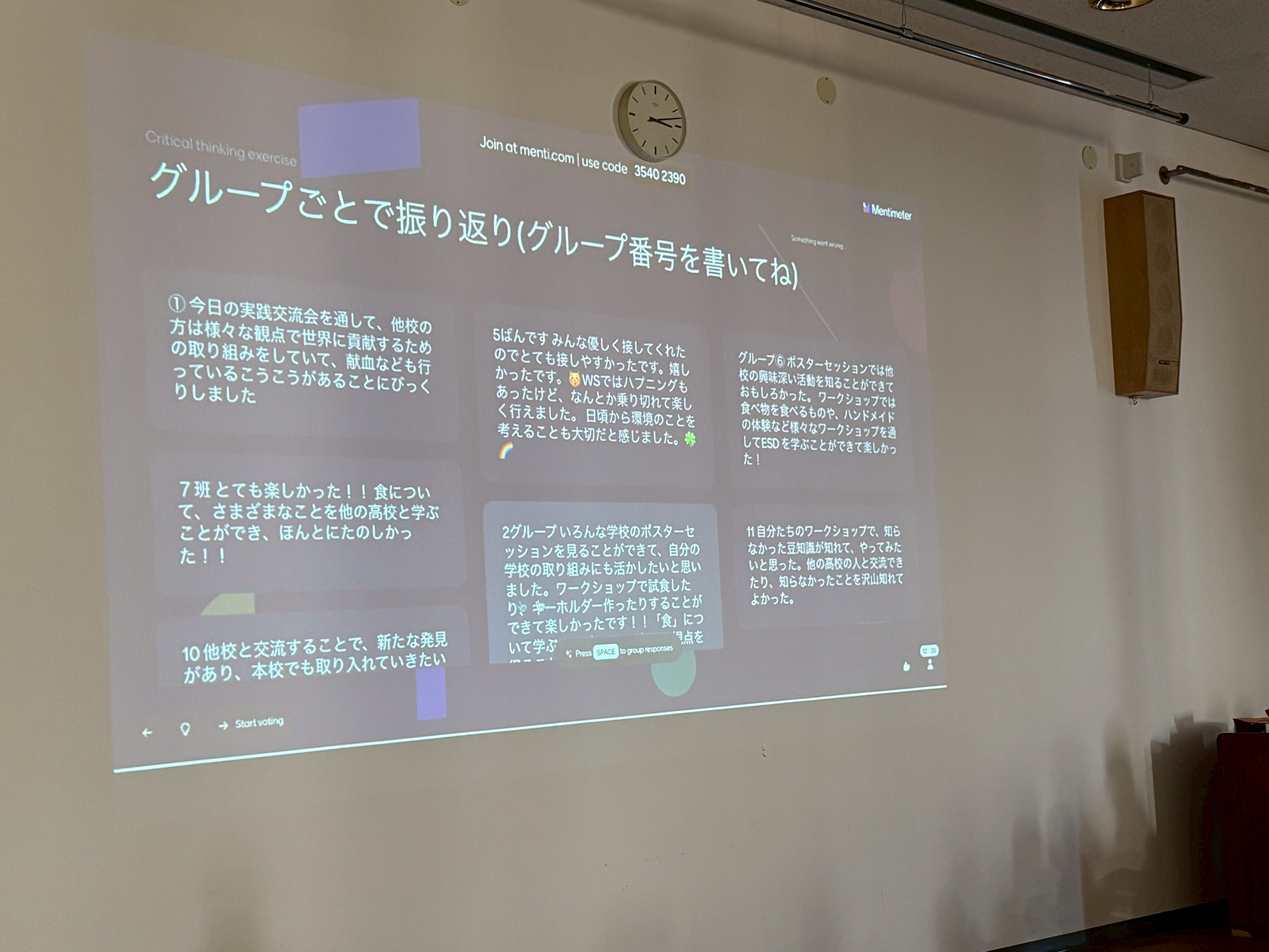 今年度の活動を一枚にまとめて、年度の報告書として掲載するニューズレターの取り組みについて説明されました。また、各高校の参加した振り返りをmentimeterを使って行いました。