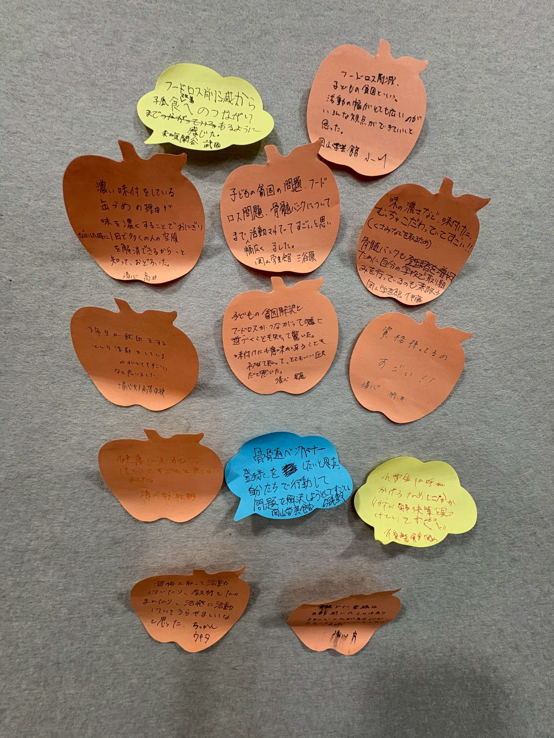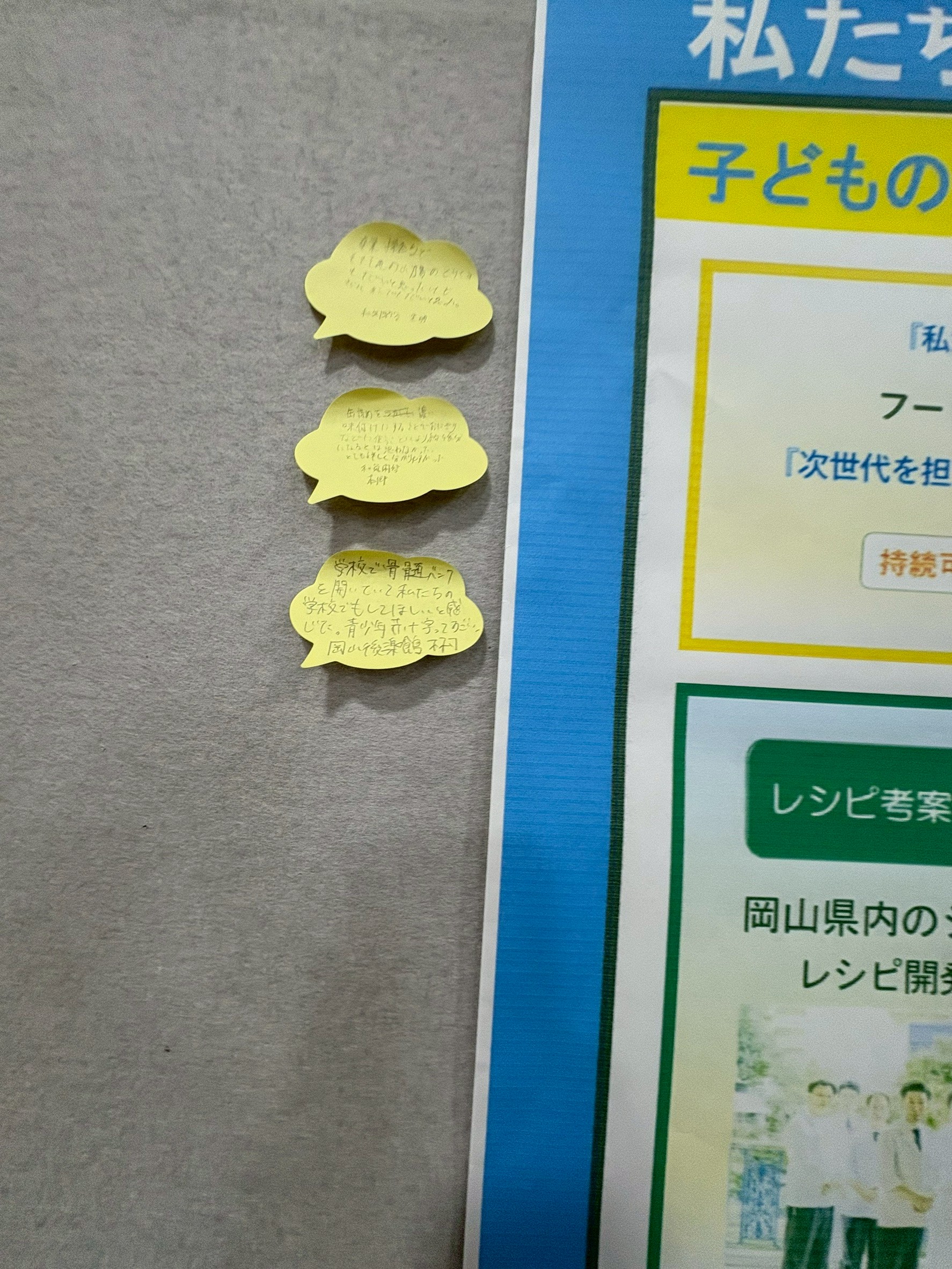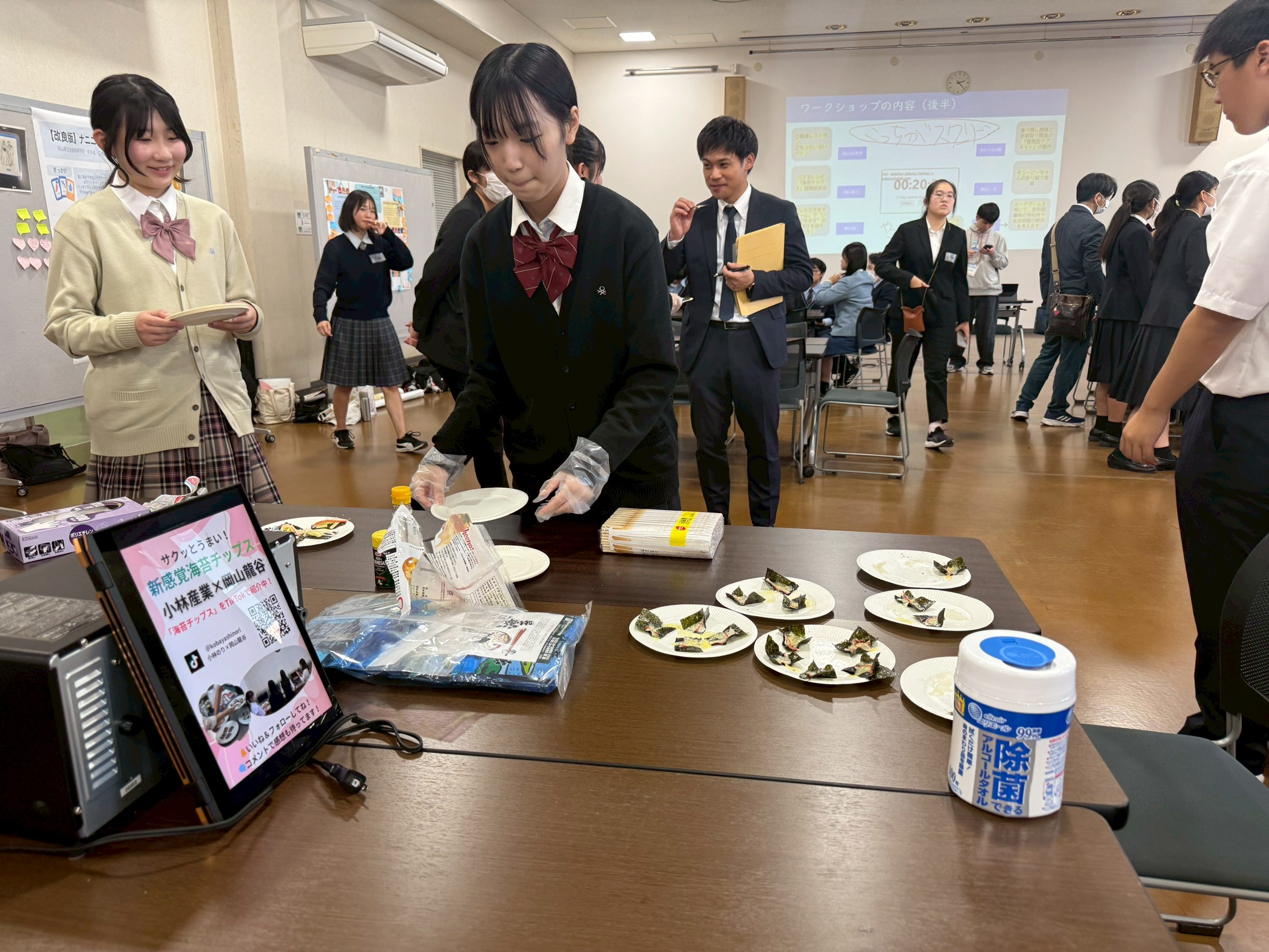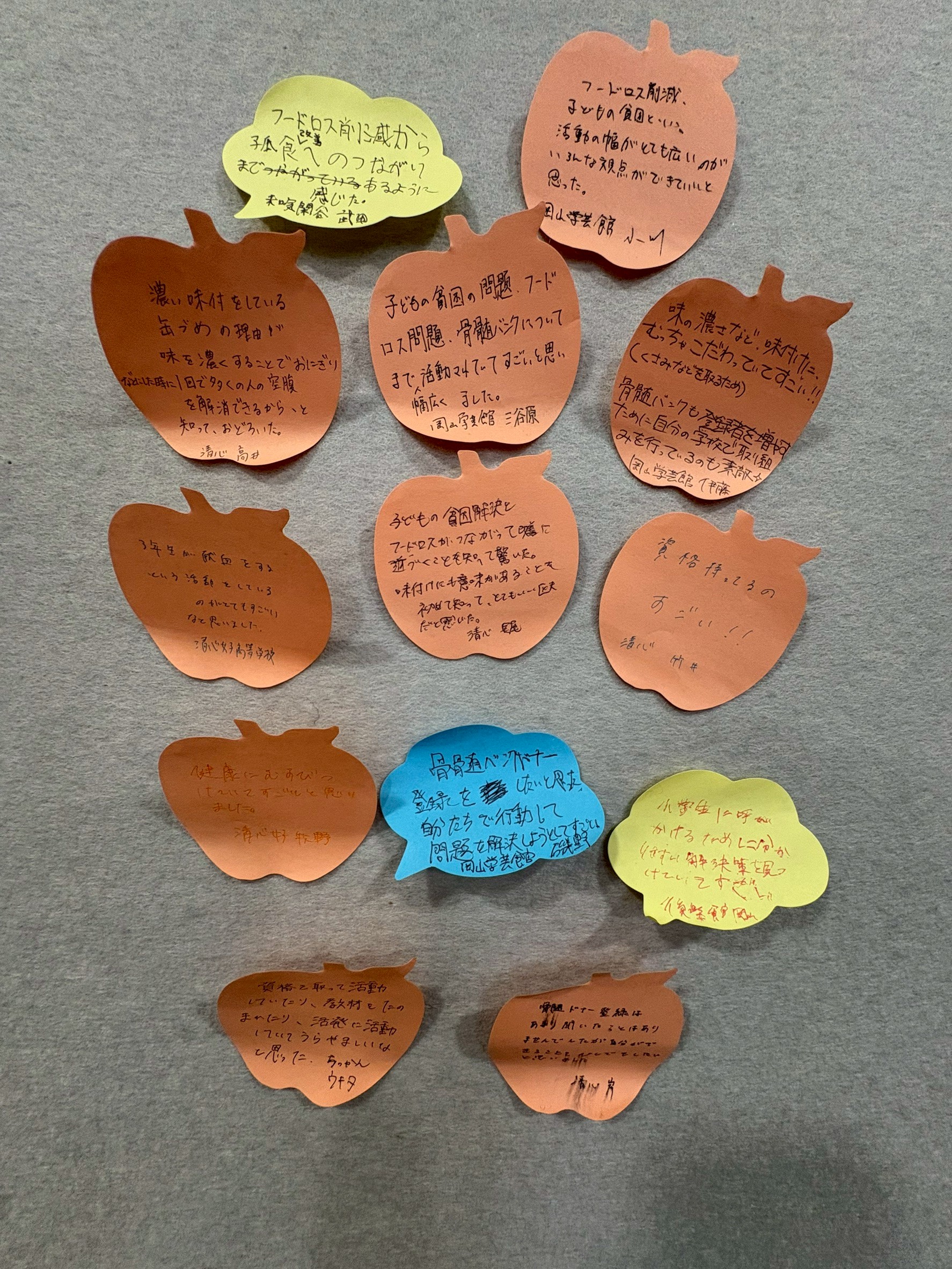色々な高校と”食”についての問題点について話し合えて良かった。特に印象に残っていることは、後楽館高校のフードロス(学校の食堂)について実際に生徒にアンケートをとったり、意見などを言える目安箱の設置など感心しました。私の家も食べ残しや、廃棄してしまう時もあるので、今日の活動で学んだ事を下に取り入れていきたいです。嬉しかったことは、ワークショップでのりチップスを食べた後に「おいしい!」や「TikTokいいねしたよ!」とか感想を伝えてくれた事が嬉しかった。
