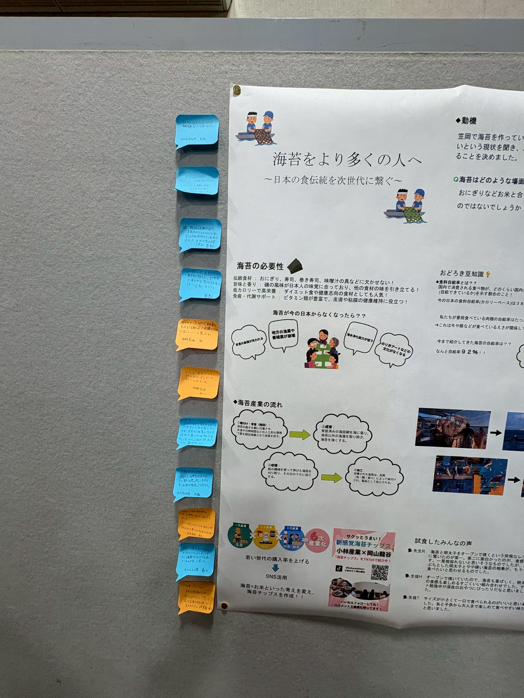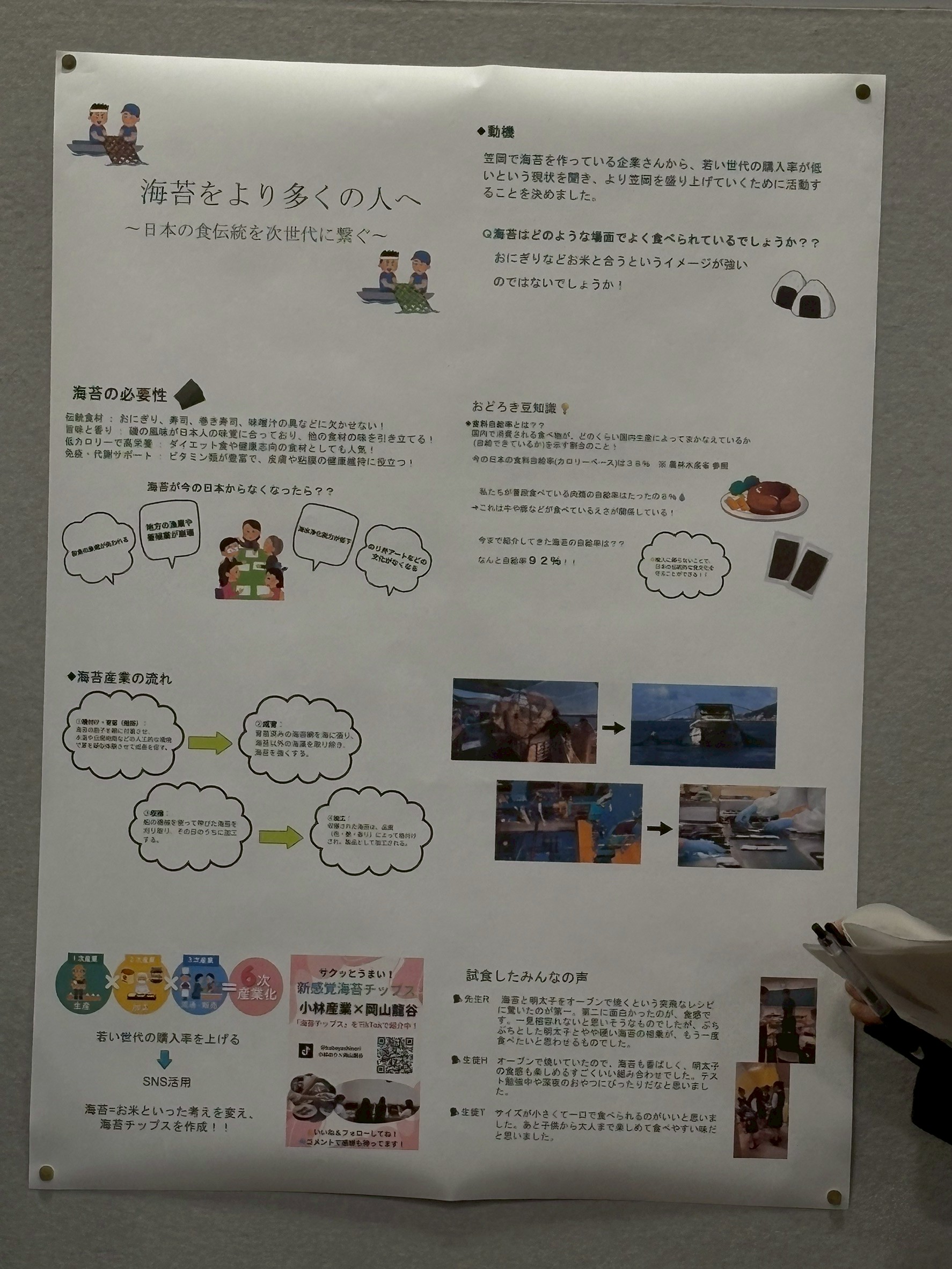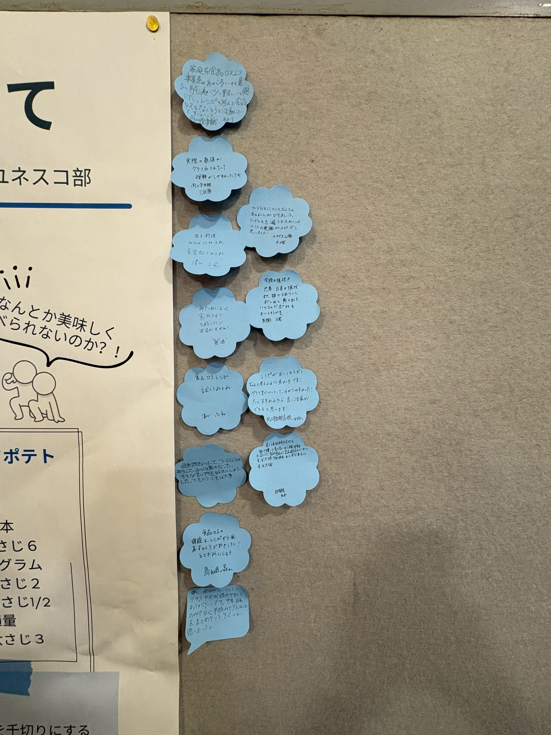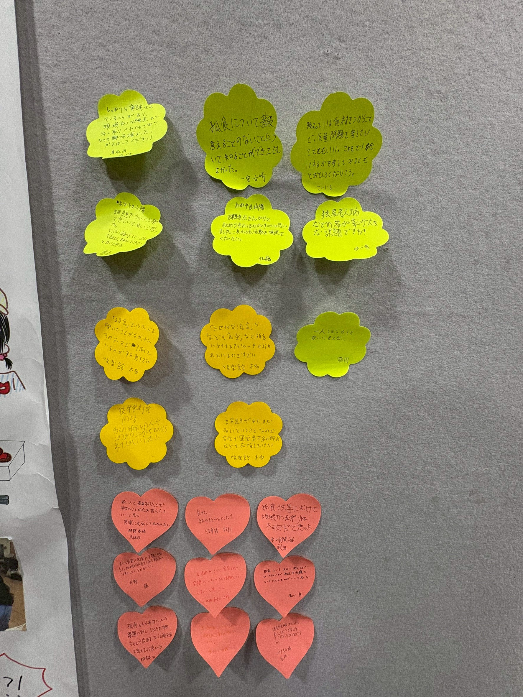 色々な高校と”食”についての問題点について話し合えて良かった。特に印象に残っていることは、後楽館高校のフードロス(学校の食堂)について実際に生徒にアンケートをとったり、意見などを言える目安箱の設置など感心しました。私の家も食べ残しや、廃棄してしまう時もあるので、今日の活動で学んだ事を下に取り入れていきたいです。嬉しかったことは、ワークショップでのりチップスを食べた後に「おいしい!」や「TikTokいいねしたよ!」とか感想を伝えてくれた事が嬉しかった。