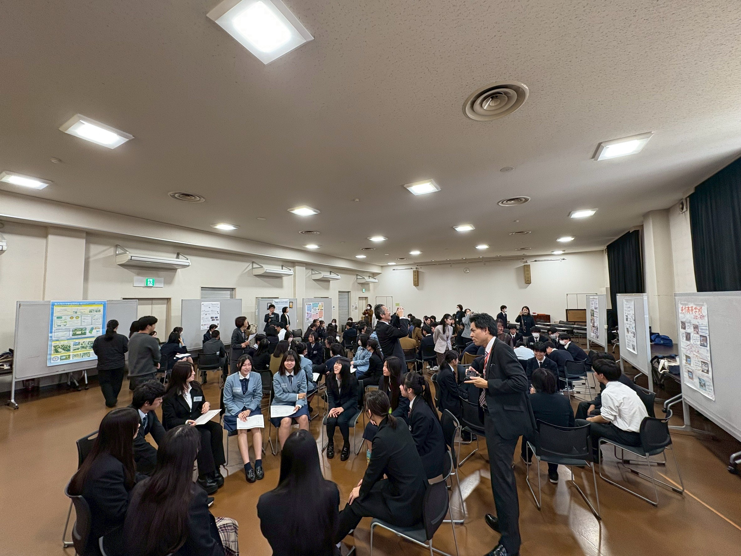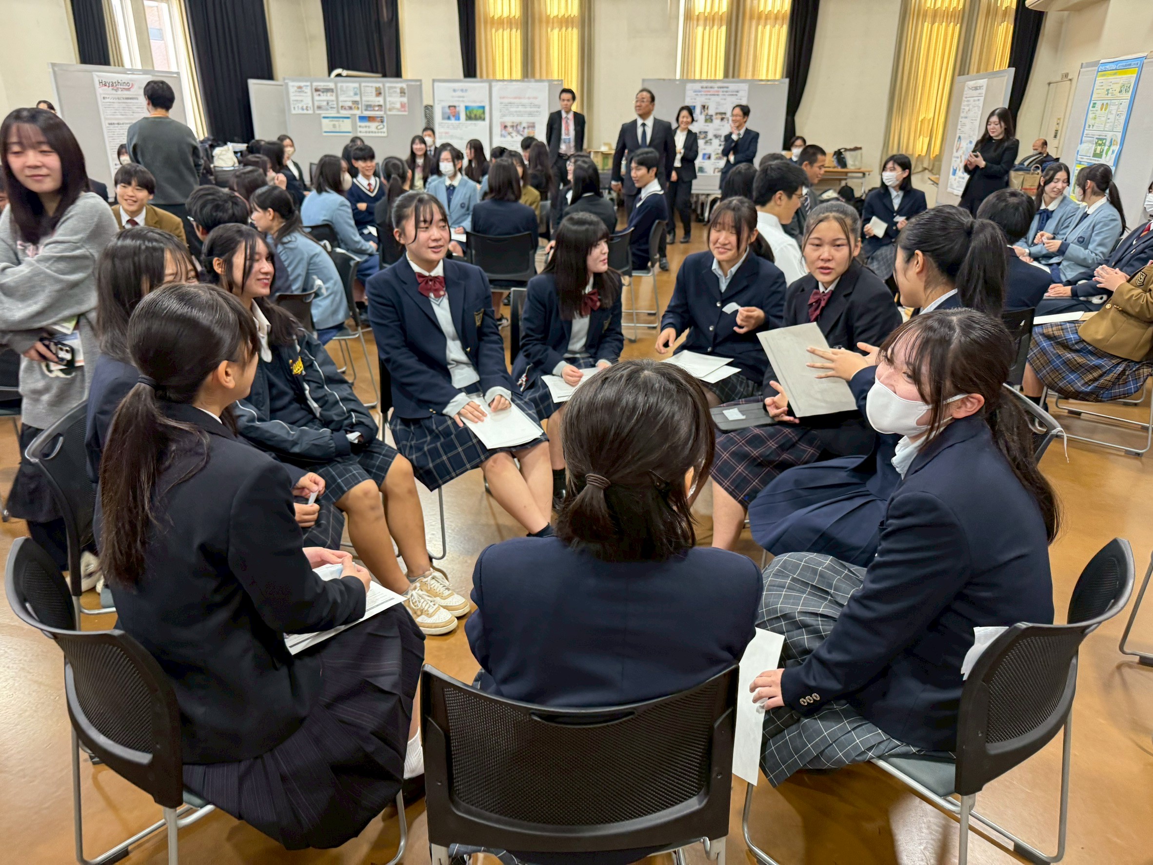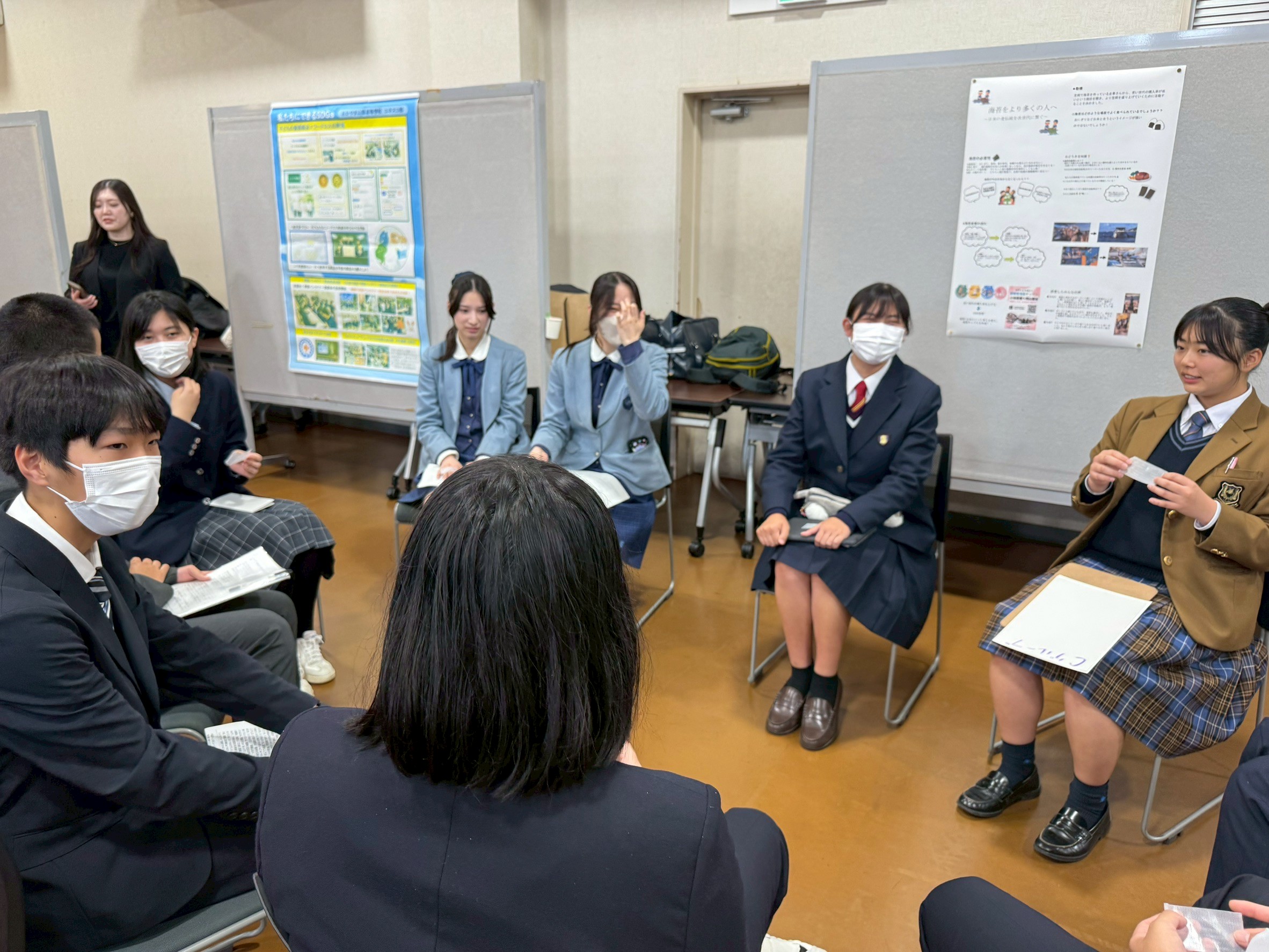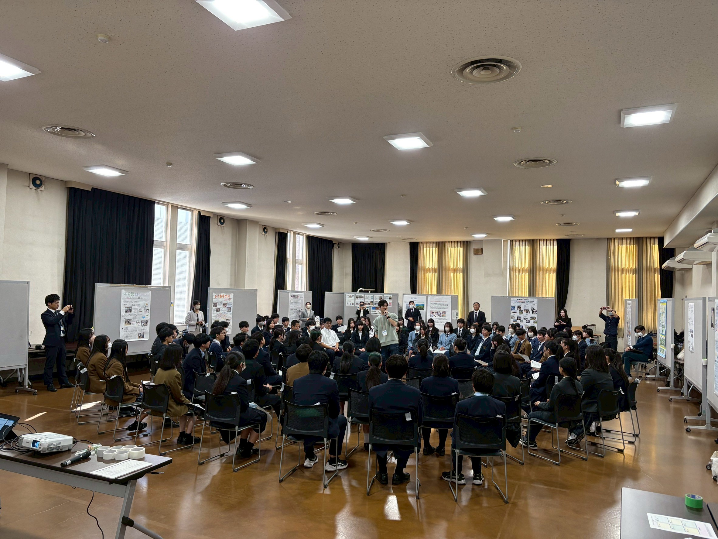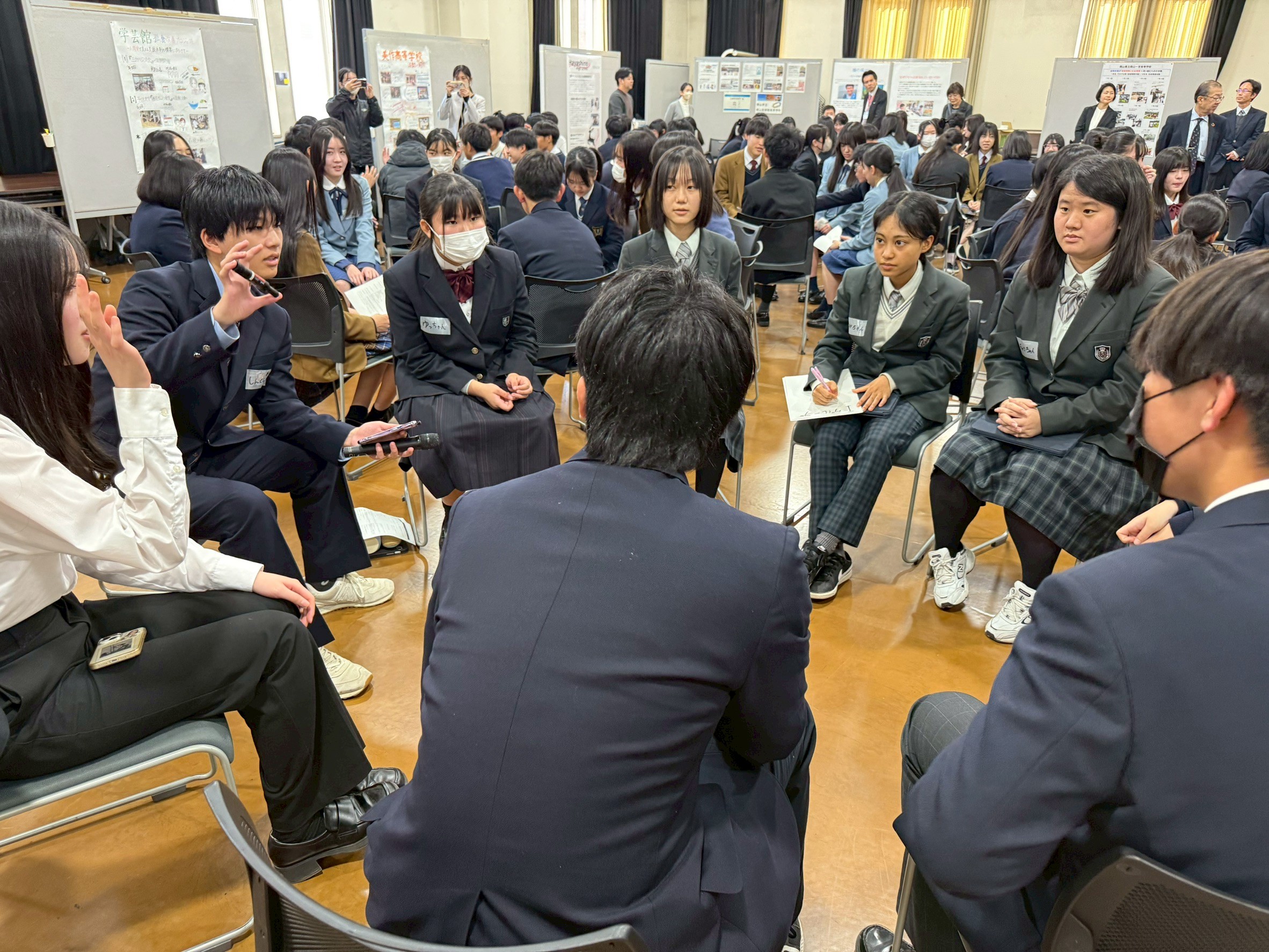 ポスターセッションでは、参加校の生徒たちがそれぞれの活動を紹介し合いました。互いに「良い」と思った点を付箋に書いて貼り付け、生徒同士が褒め合い、認め合う姿が見られました。