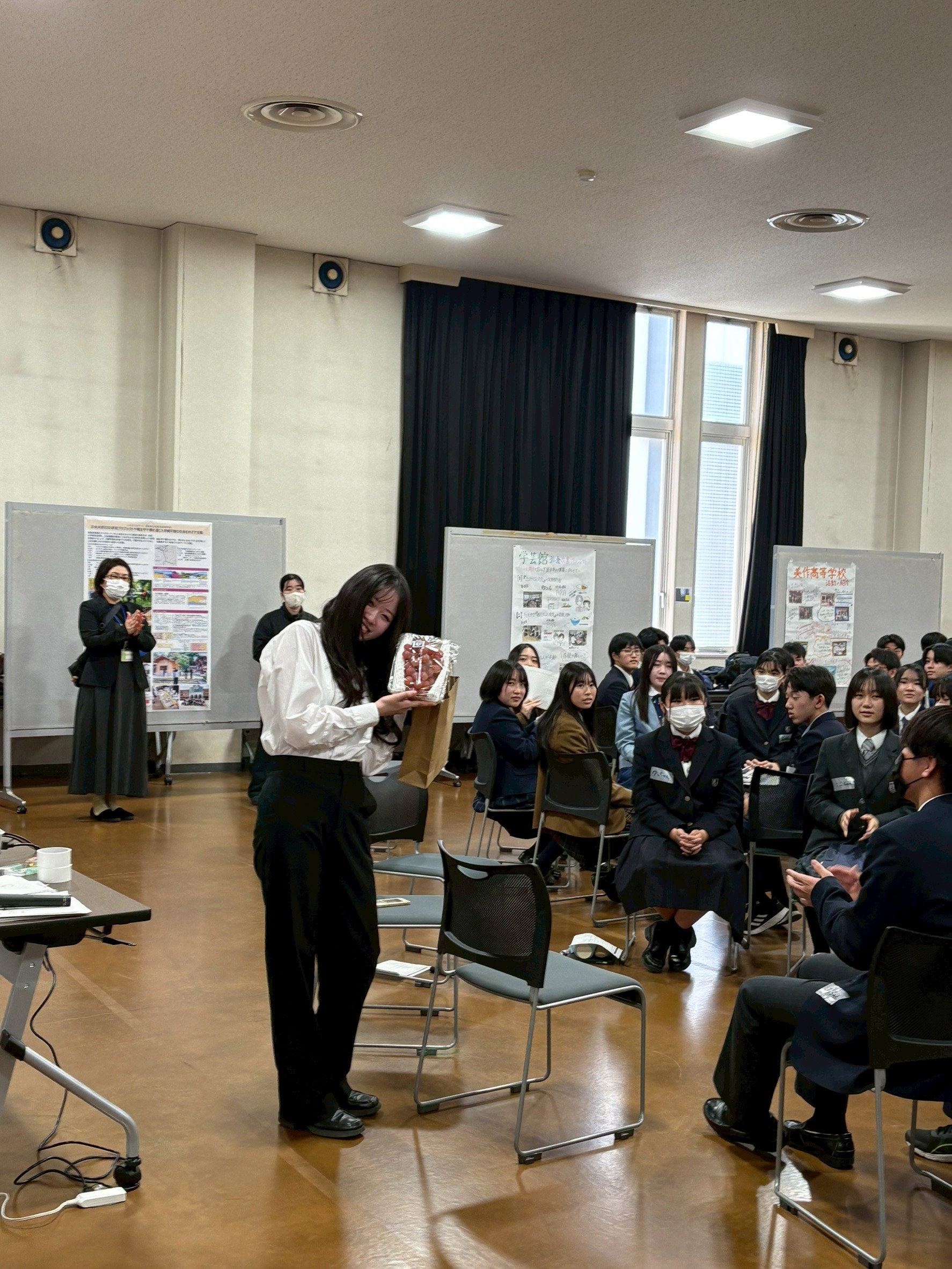 色々な高校と”食”についての問題点について話し合えて良かった。特に印象に残っていることは、後楽館高校のフードロス(学校の食堂)について実際に生徒にアンケートをとったり、意見などを言える目安箱の設置など感心しました。私の家も食べ残しや、廃棄してしまう時もあるので、今日の活動で学んだ事を下に取り入れていきたいです。嬉しかったことは、ワークショップでのりチップスを食べた後に「おいしい!」や「TikTokいいねしたよ!」とか感想を伝えてくれた事が嬉しかった。