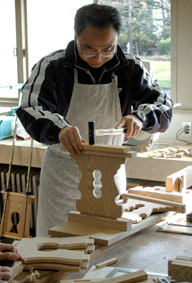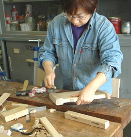 | ↓組立に入った北島さん | 藤原さんも端ばめの加工を終 えて組み付けです |