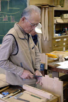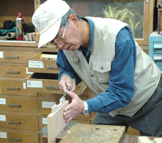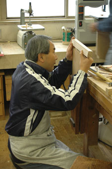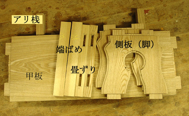 | 並行してアリ桟や畳ズリとのホゾを加工、大まかにはバンドソーで切り取り、細部はノミで仕上げます、 ホゾ厚側の掻き取りはルーターテーブルを使って頂きましたが、個々に厚みが違っていたので削りかたを 少し変更 |