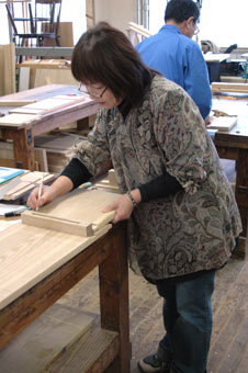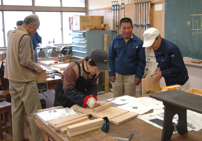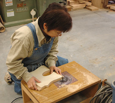 | 1日目はずいぶん進みましたので、2日は皆さん足並みを揃えて側(脚)の加工です 側はトリマーでテンプレート加工をします、テンプレートも用意はしましたができるだけオリジナルの 形を考えて頂き型を作って頂きました、(サイズが異なっても、何人かで工夫して共用されていました) |