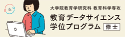 教育学研究科修士課程「教育データサイエンス学位プログラム」では、学校・家庭・地域・職場等、人間が生活するあらゆる場における教育を対象とした諸科学を探究します。教育とデータサイエンス、ならびに関連諸領域に関する深い専門的な知識をもとに、ICT・データサイエンス活用スキルを組み合わせた高度な課題解決能力を涵養し、あわせて、社会に存在する諸課題を主体的に捉え、その解決に向けてビッグデータを的確に解析・活用して有益な知見を導き出すことのできる転移可能な応用力を身につけることにより、デジタル技術の活用により様々な変革が想定されるこれからの時代を牽引する次世代エキスパート養成を目的とした教育を行います。